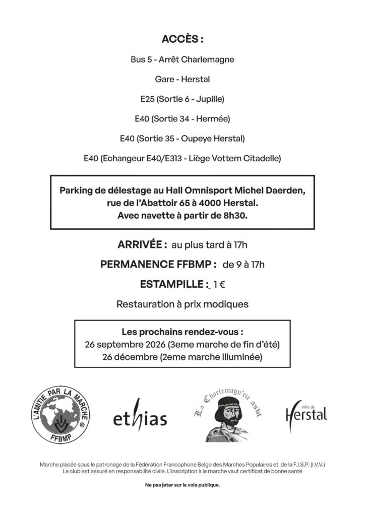 Marche placée sous le patronage de la Fédération Francophone Belge des Marches Populaires et de la F.I.S.P. (I.V.V.)